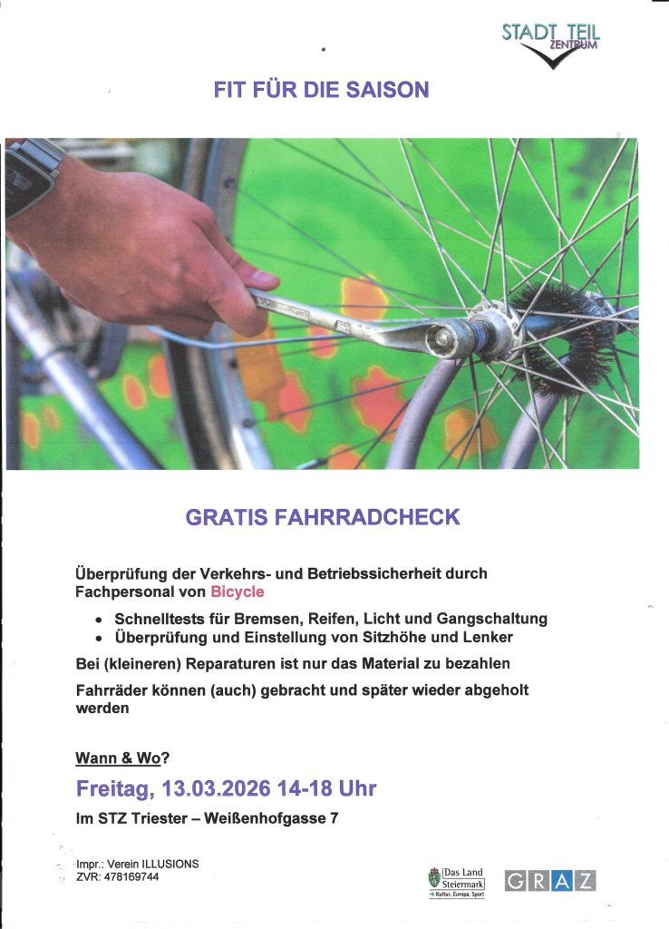 Lassen Sie Ihr Fahrrad gratis auf Verkehrssicherheit überprüfen. Die Firma Bycicle ist als kompetenter Partner bei uns vor Ort. Natürlich werden auch Reparaturen durchgeführt. Voranmeldungen unter 0699 – 14888866 oder direkt im Stadtteilzentrum Montag von 16:00 bis 19:00 Uhr und Donnerstag von 10:00 bis 13:00 Uhr.